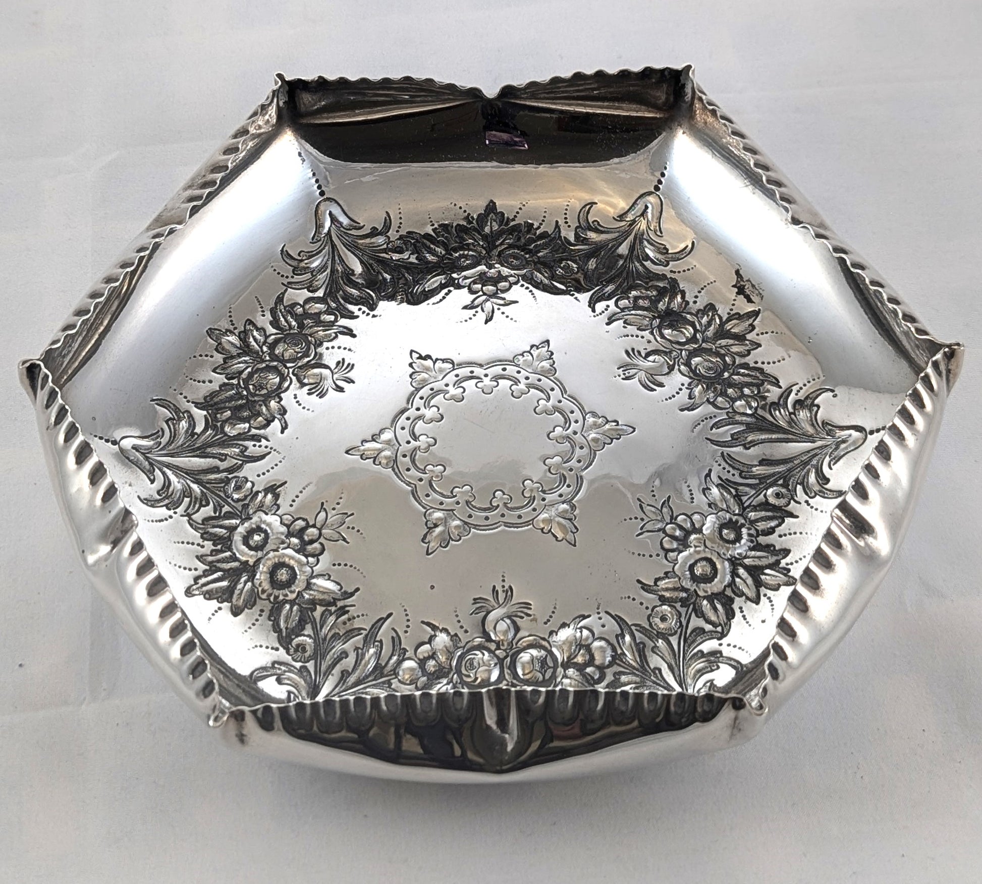 The enchanting floral design adorns this beautiful dish, showcasing the artistry and dedication that John Sherwood & Sons infused into their silver-plated creations. Measuring 24cm at the widest point and 22cm at the narrowest, with a depth of approximately 4cm, it boasts a generous size perfect for showcasing your favourite fruits or serving delectable mints and chocolates during festive gatherings and special occasions.