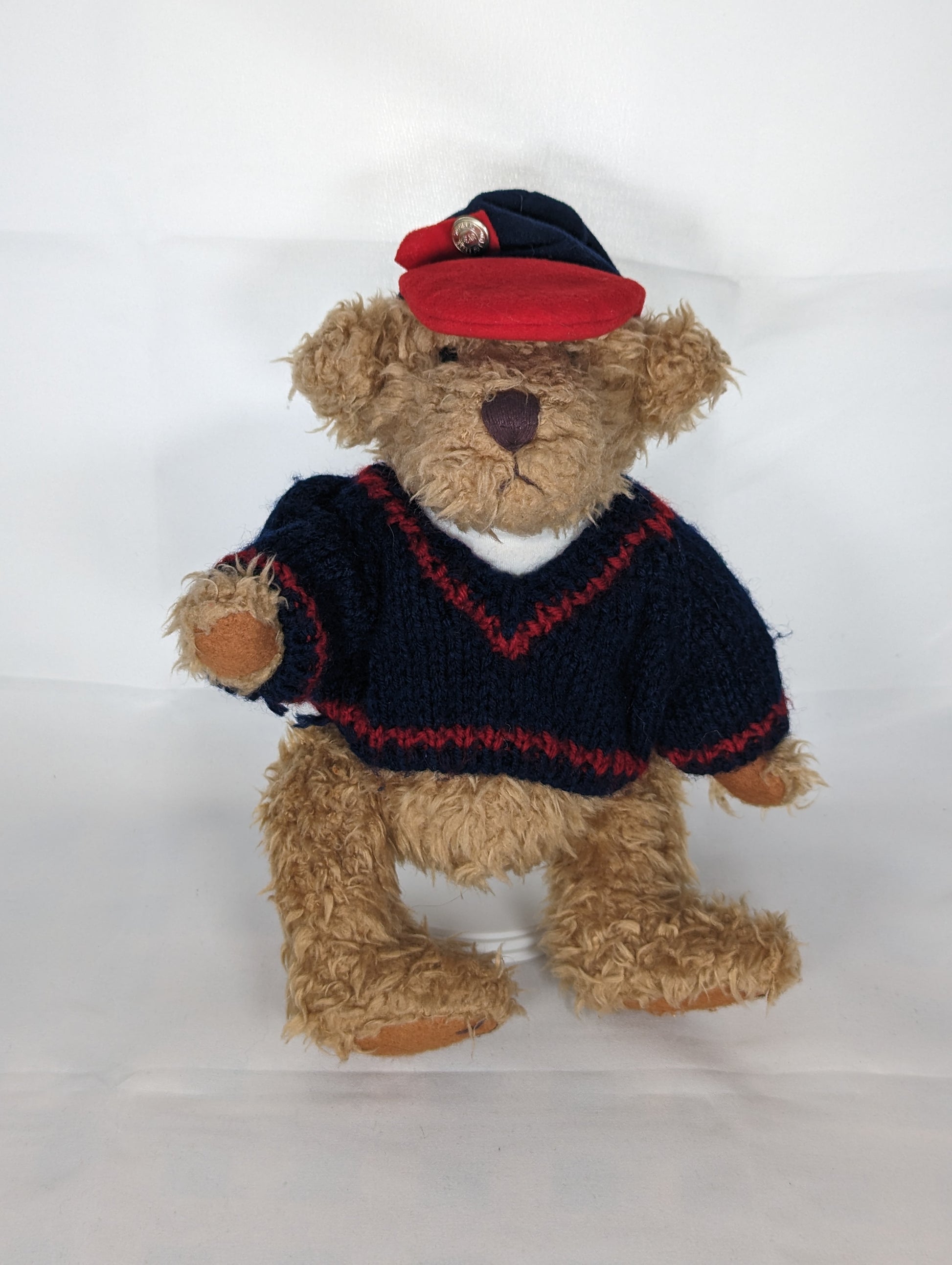Sporting a vibrant red baseball hat adorned with the iconic brass button, Tully is the epitome of cuteness and nostalgia. With its navy jumper adding a touch of classic style, this bear is a true gem that will bring a smile to your face every time you lay eyes on it.