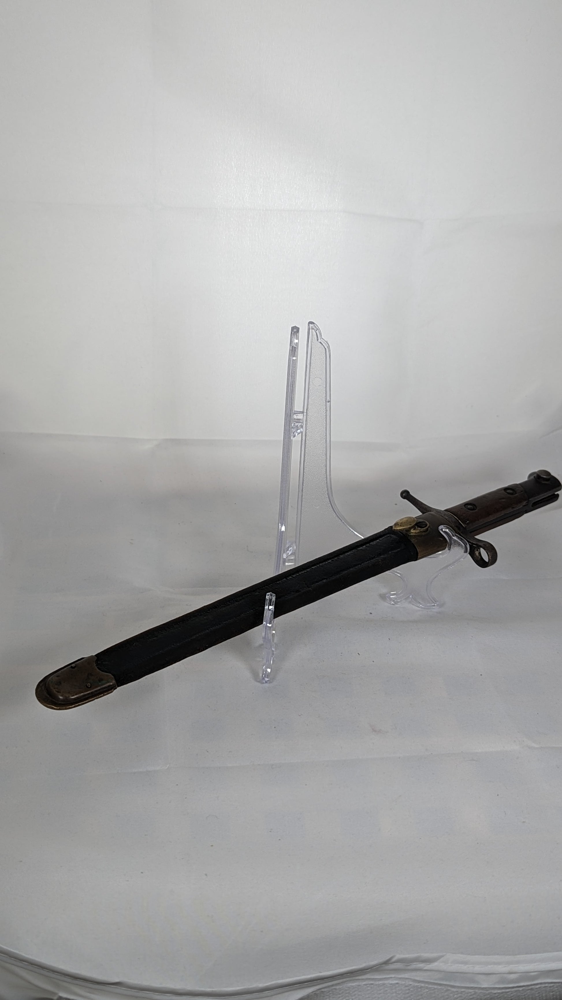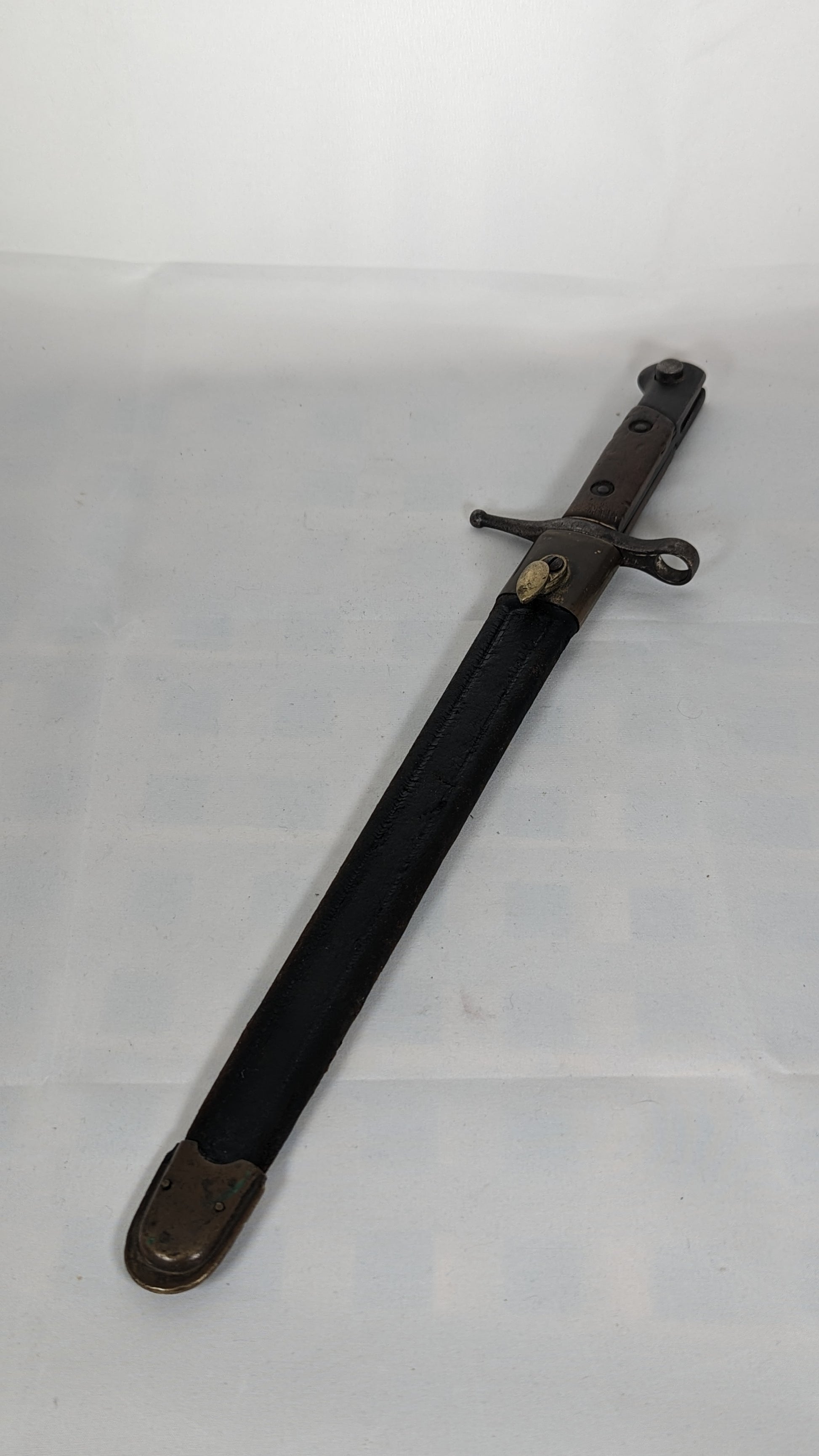 While many bayonets of this era show signs of wear, this particular piece stands out with its remarkable condition. With a good tidiness that belies its age, it proudly displays its original brass mounted leather scabbard, adding an extra touch of authenticity.