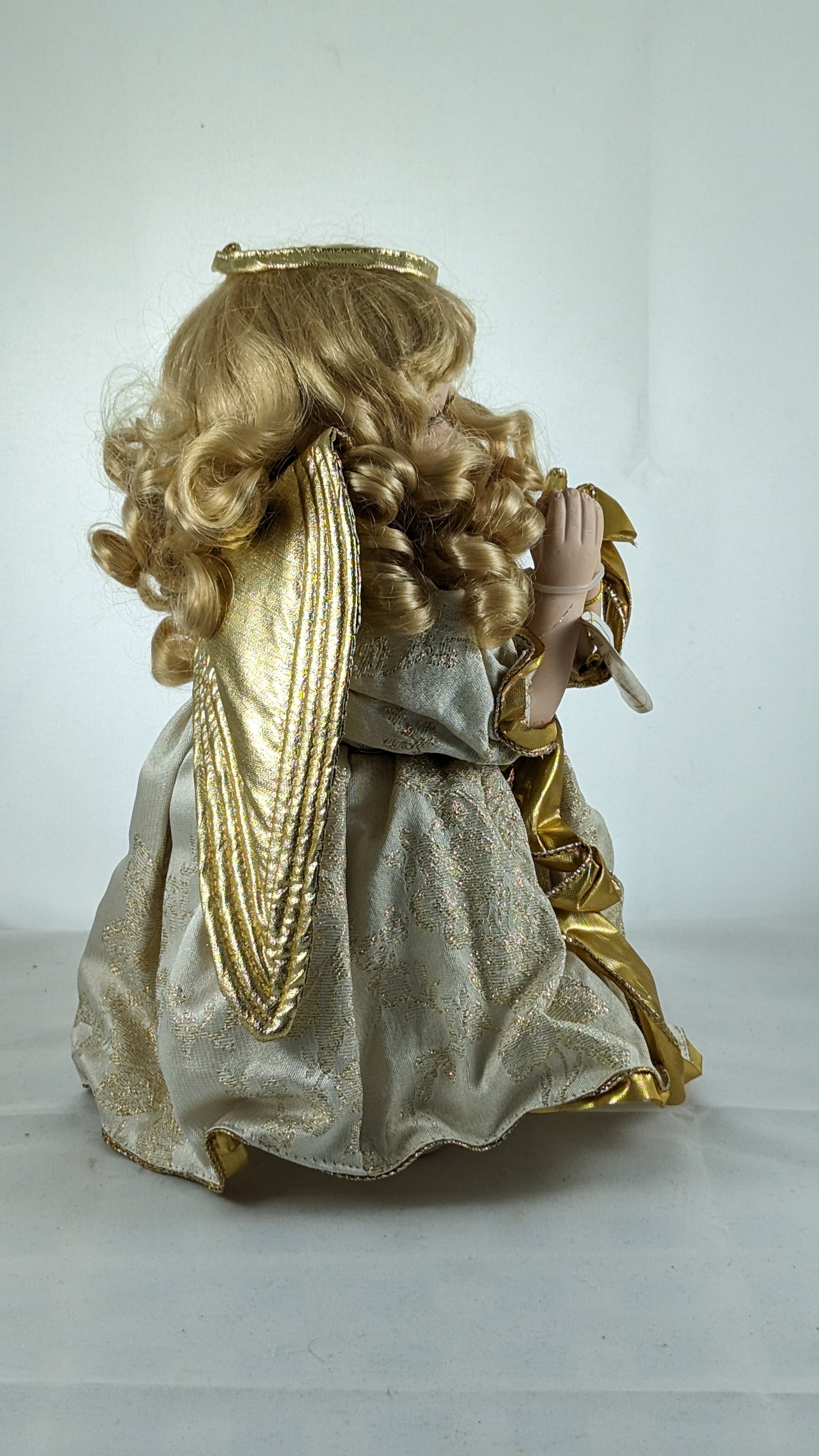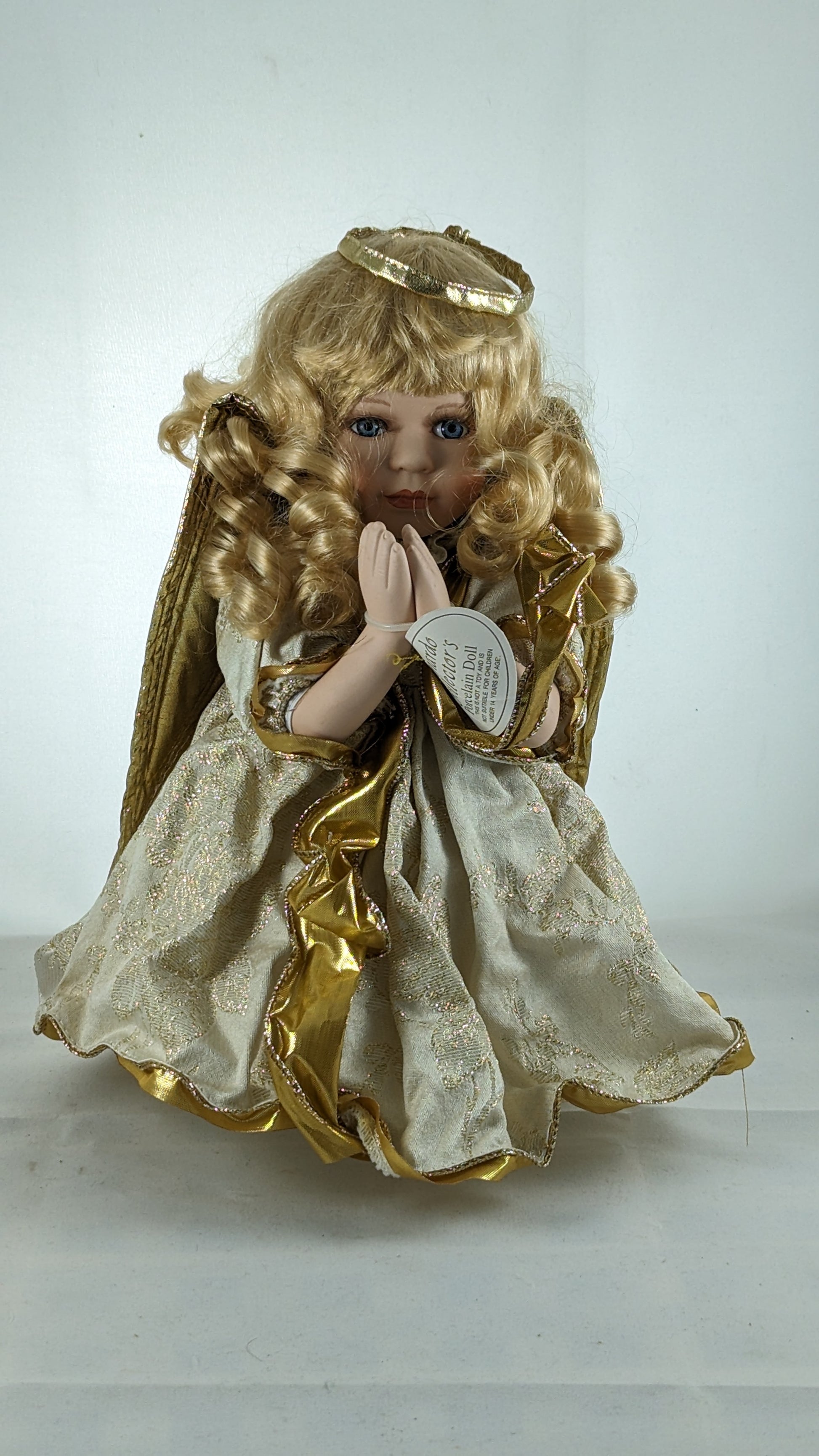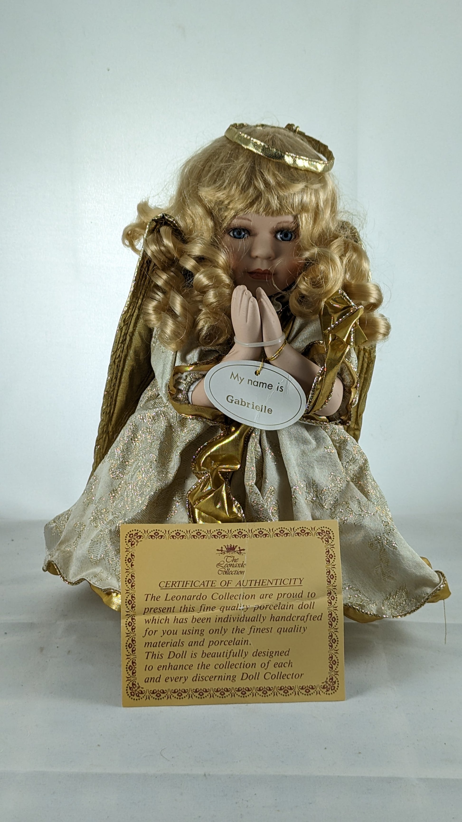 Perfect for the holiday season or as a cherished addition to your collection, this porcelain doll is a sight to behold. Every intricate detail has been meticulously crafted, from the delicate folds of her gown to the intricate feather-like wings adorning her back. Truly, Gabrielle is a heavenly vision brought to life.