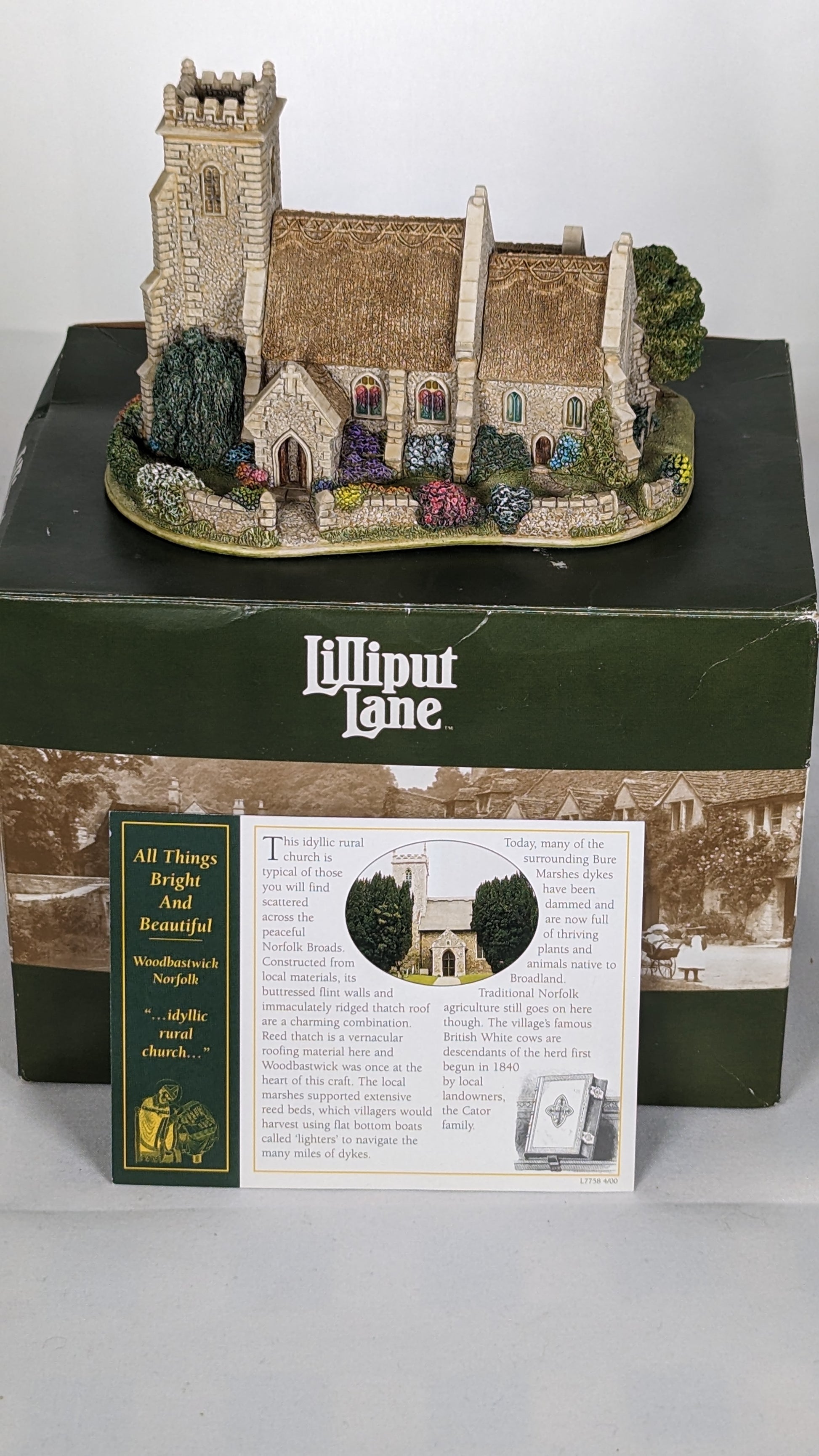 Step into the enchanting world of Lilliput Lane with "All Things Bright and Beautiful." This delightful miniature church captures the essence of idyllic rural charm, transporting you to the peaceful Norfolk Broads. Inspired by the quaint church in Woodbastwick, Norfolk, this intricately crafted piece will captivate your heart and imagination.