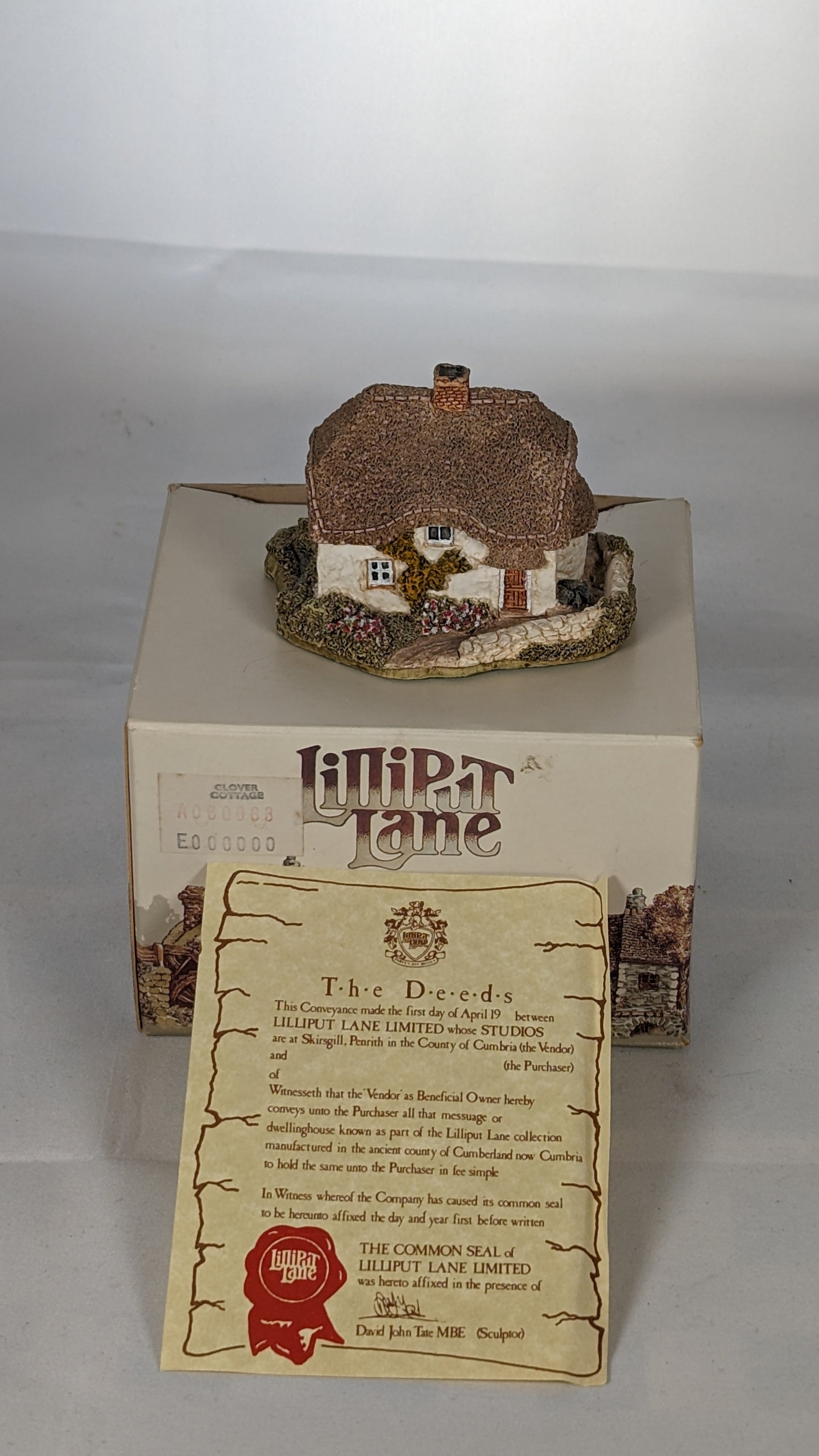As you gaze upon Clover Cottage, you can't help but marvel at its pristine condition. It stands proudly, a testament to the craftsmanship that has withstood the test of time. With the original box and title deeds in hand, this miniature treasure is ready to be cherished and admired.