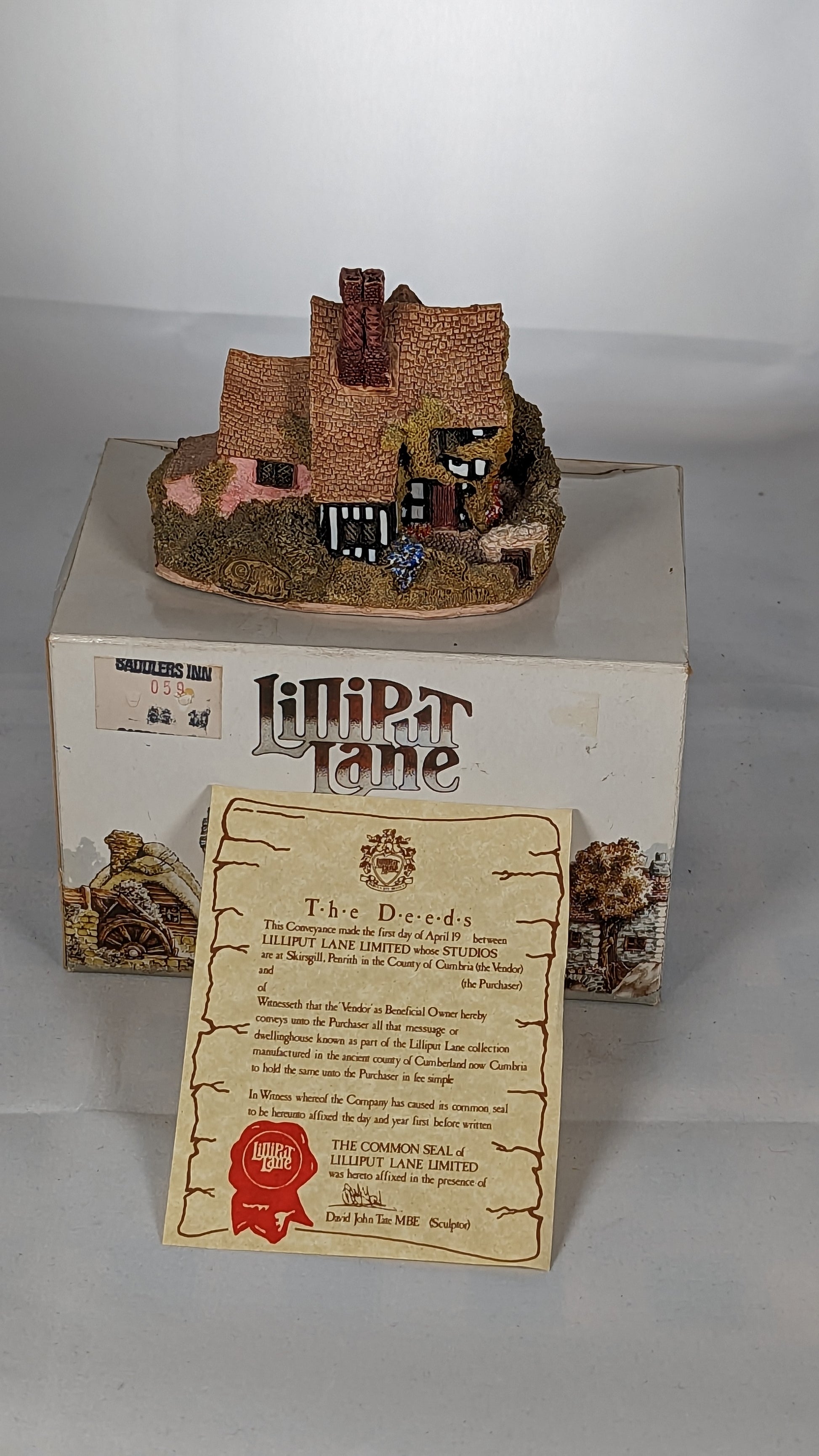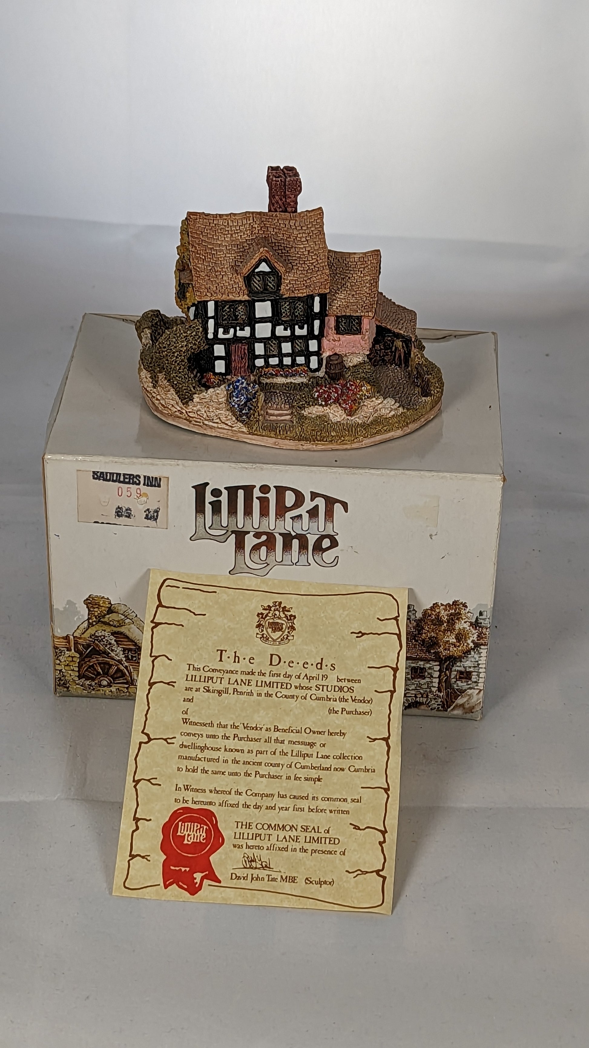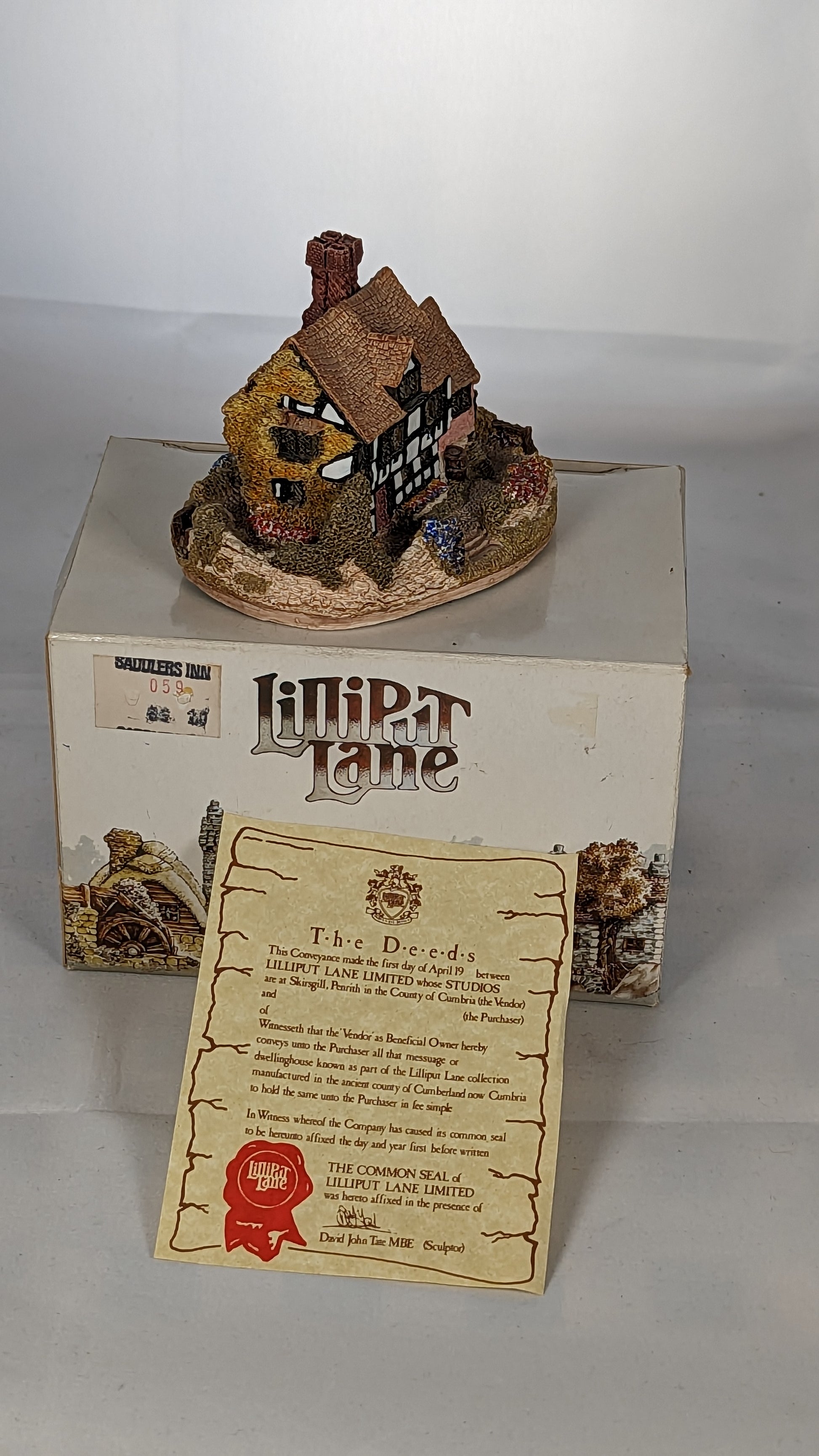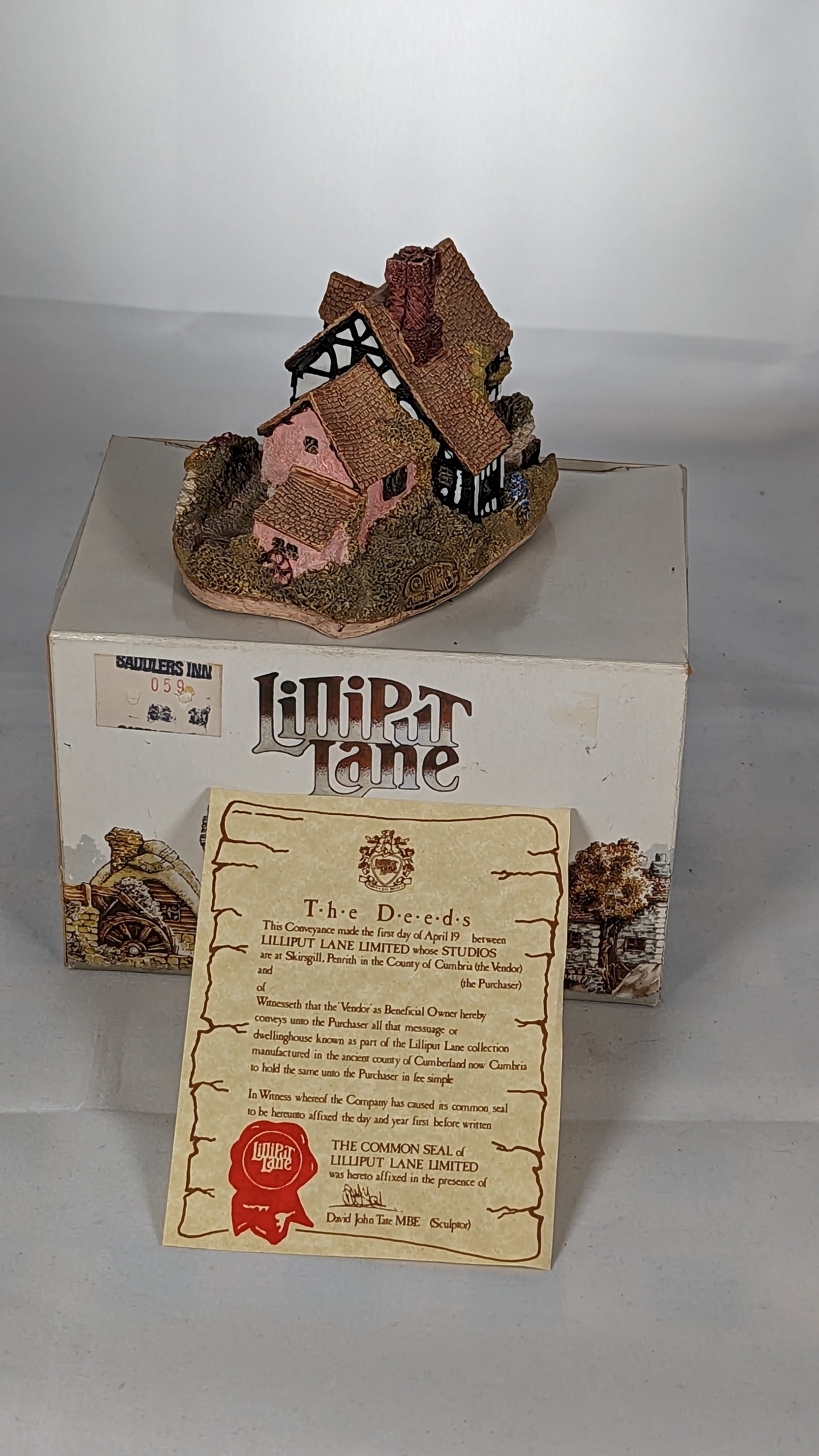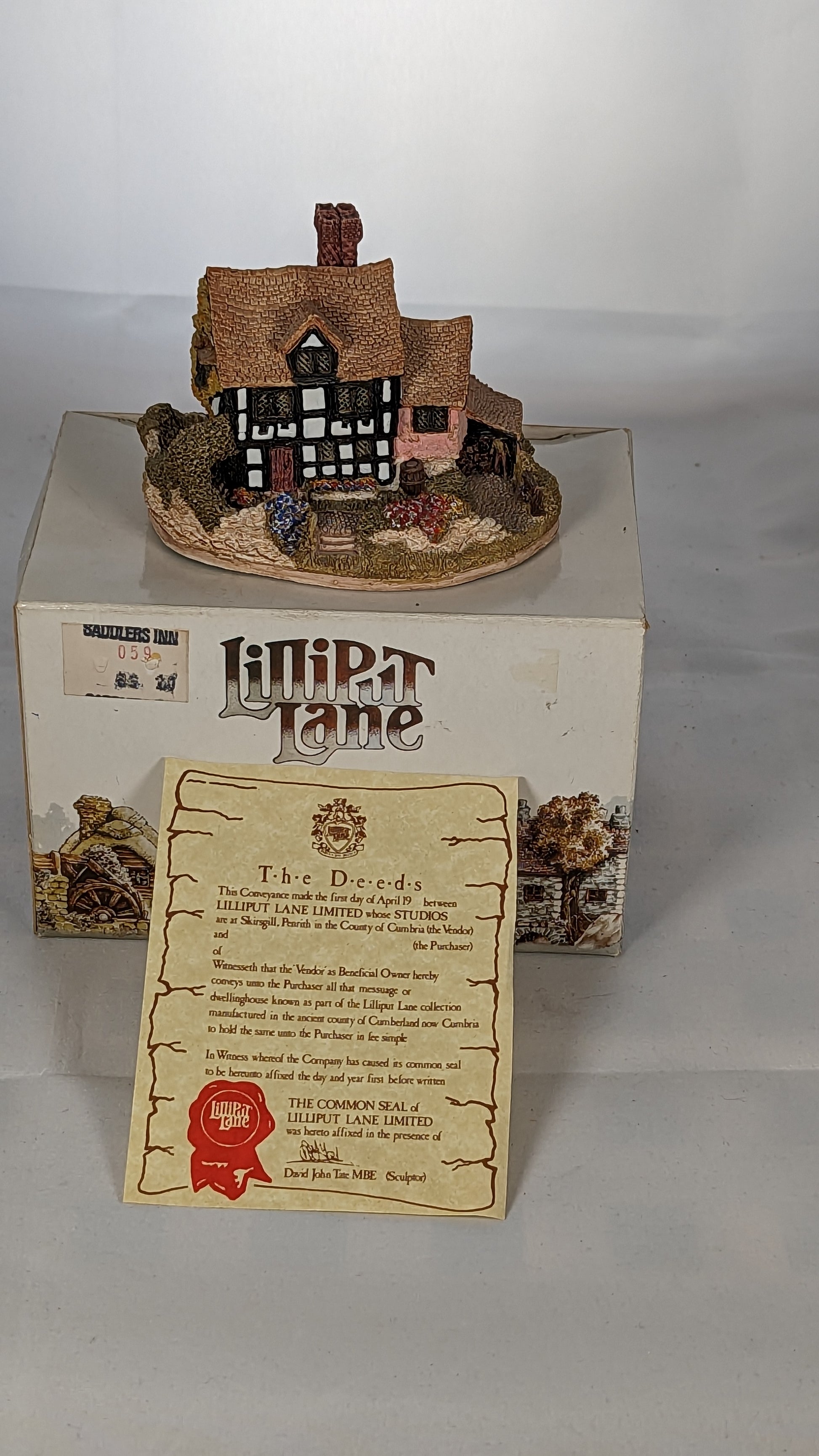 While the stables that once housed patrons' horses may have vanished over time, the Lilliput Lane "Saddlers Inn" remains in remarkable condition. With its original box and title deeds, it's a true collector's treasure that will bring joy and wonder to any miniature enthusiast.