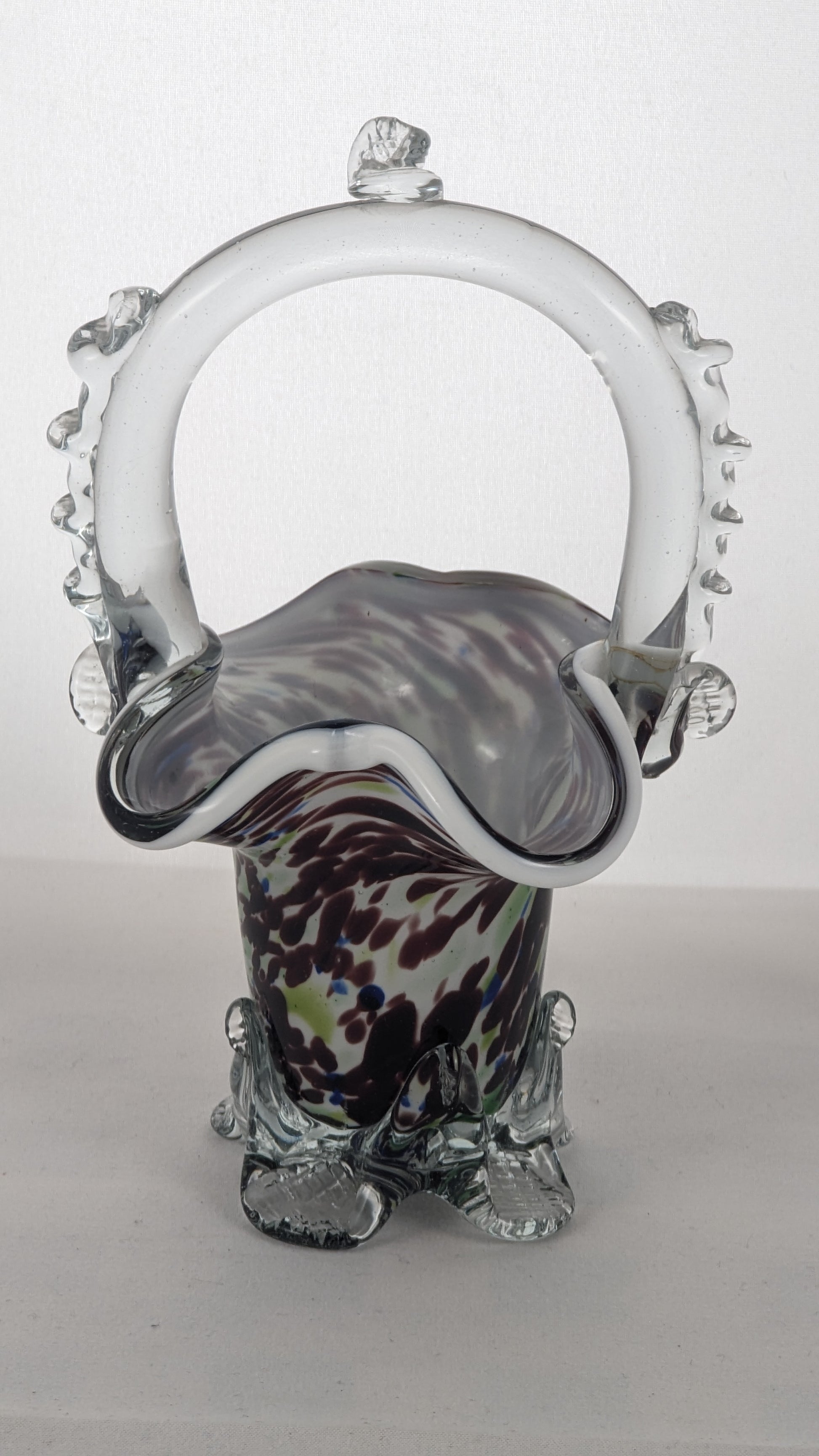 Capture the essence of timeless romance with our exquisite Murano Glass Posy Basket. This striking piece of art glass is a true testament to the mastery of Murano craftsmanship. With its mesmerizing blend of multi-colored brown, green, blue, and white patterns, this posy basket is a captivating display of elegance and beauty.