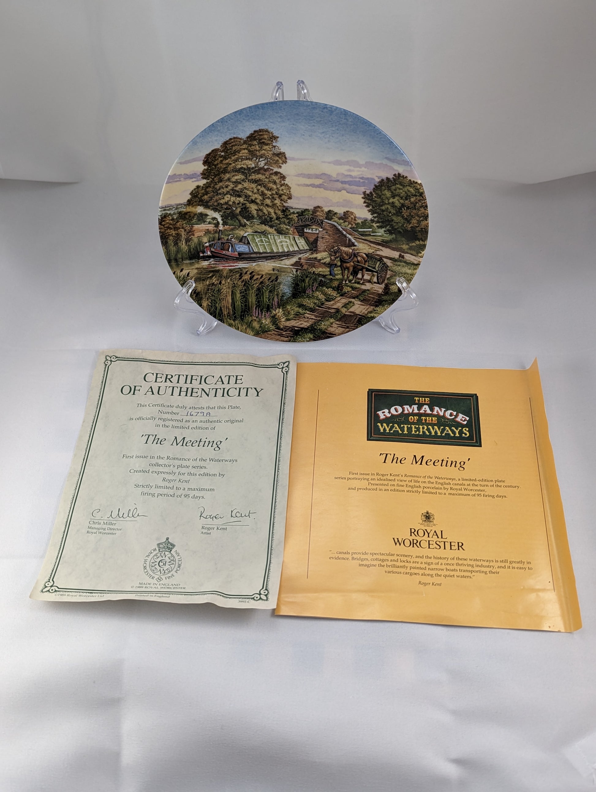 Experience the enchantment of a bygone era with the Royal Worcester 'The Meeting' limited edition plate. Transport yourself to a picturesque canal scene where a graceful boat glides into a lock, while a dapper gentleman and his noble steed exchange a friendly wave with the boatmen. This captivating artwork captures a moment of serendipitous connection, immortalized on fine porcelain.