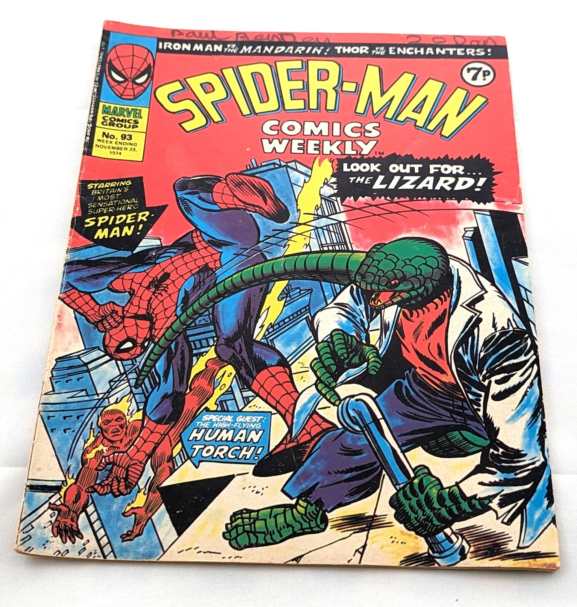 Step back in time to the nostalgic era of 1974 with Spider Man Comics Weekly #93! 🕷️✨ This Bronze Age beauty, dated November 23, 1974, is a true relic for any comic book enthusiast. While a few wear marks playfully dance along the spine, and a name has been written on the top of the cover, the inside is in great condition, revealing a treasure trove of adventures waiting to be rediscovered!