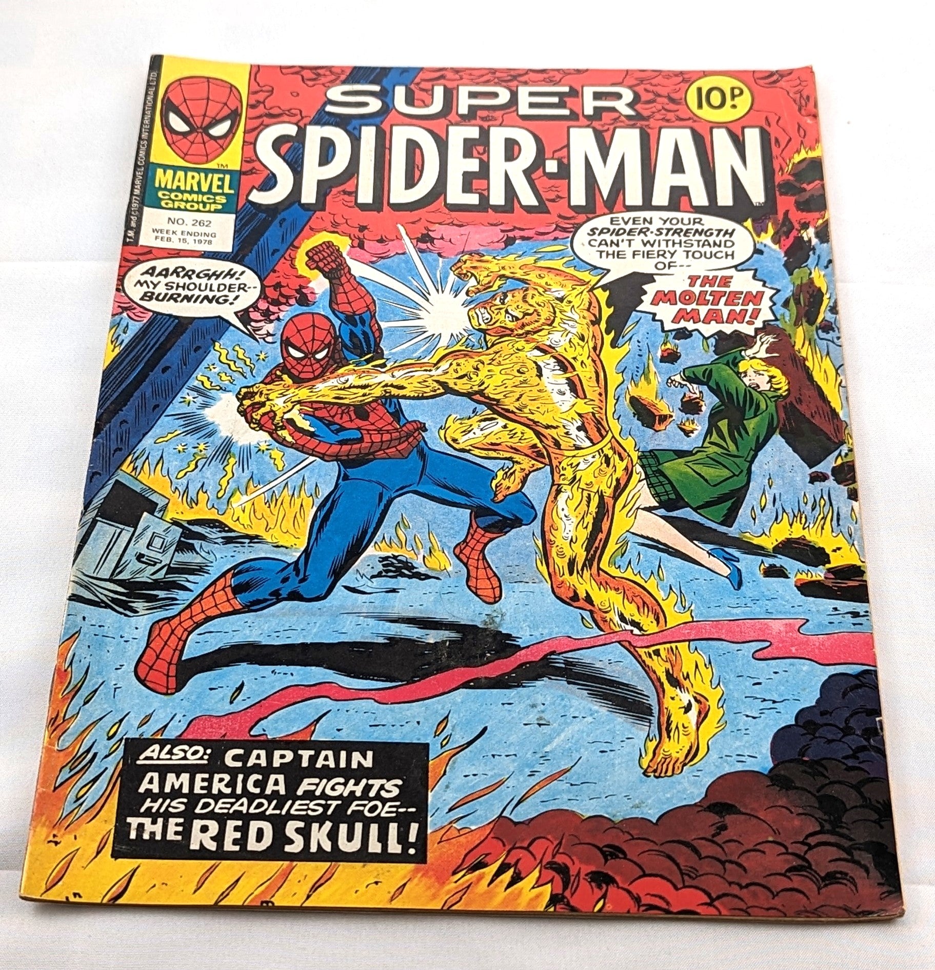 Step back in time with Super Spider Man #262 from 1978 by Marvel Comics Group. This classic comic transports you to an era of wonder and superheroes where good battles evil in exhilarating adventures. The slight fold mark on the top right cover page adds character and authenticity to this piece of comic history.