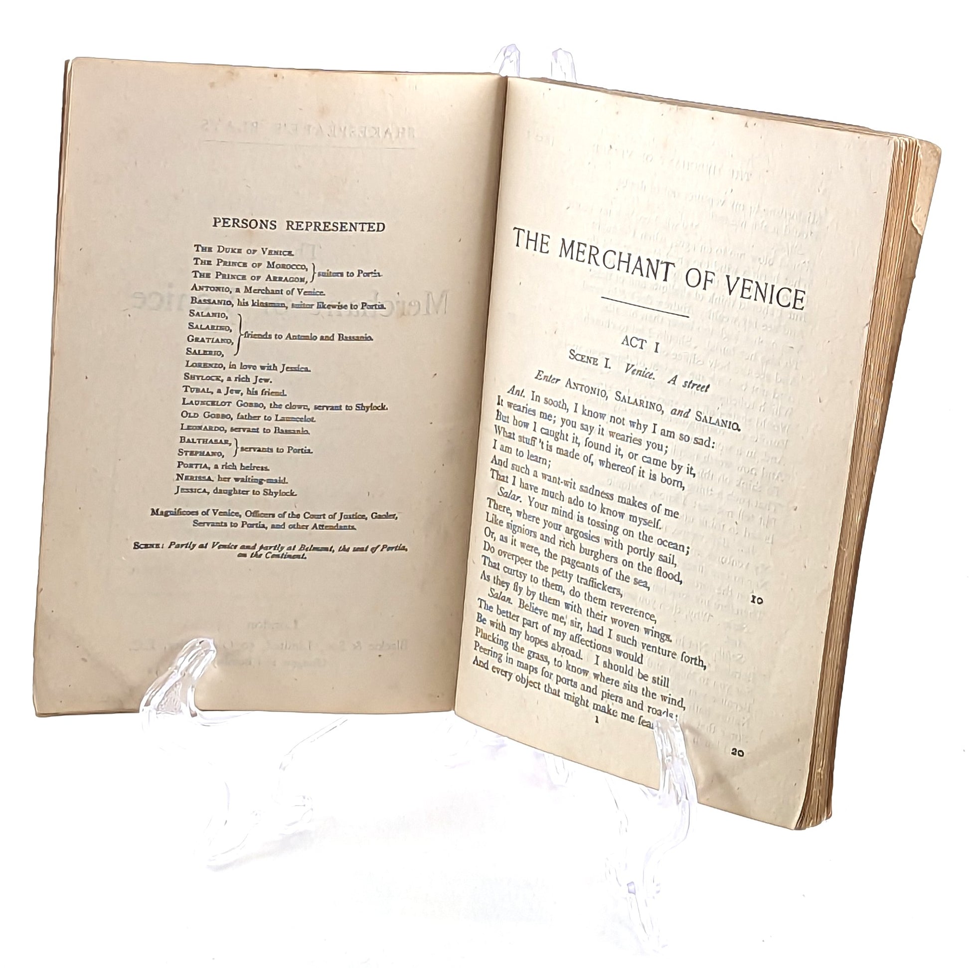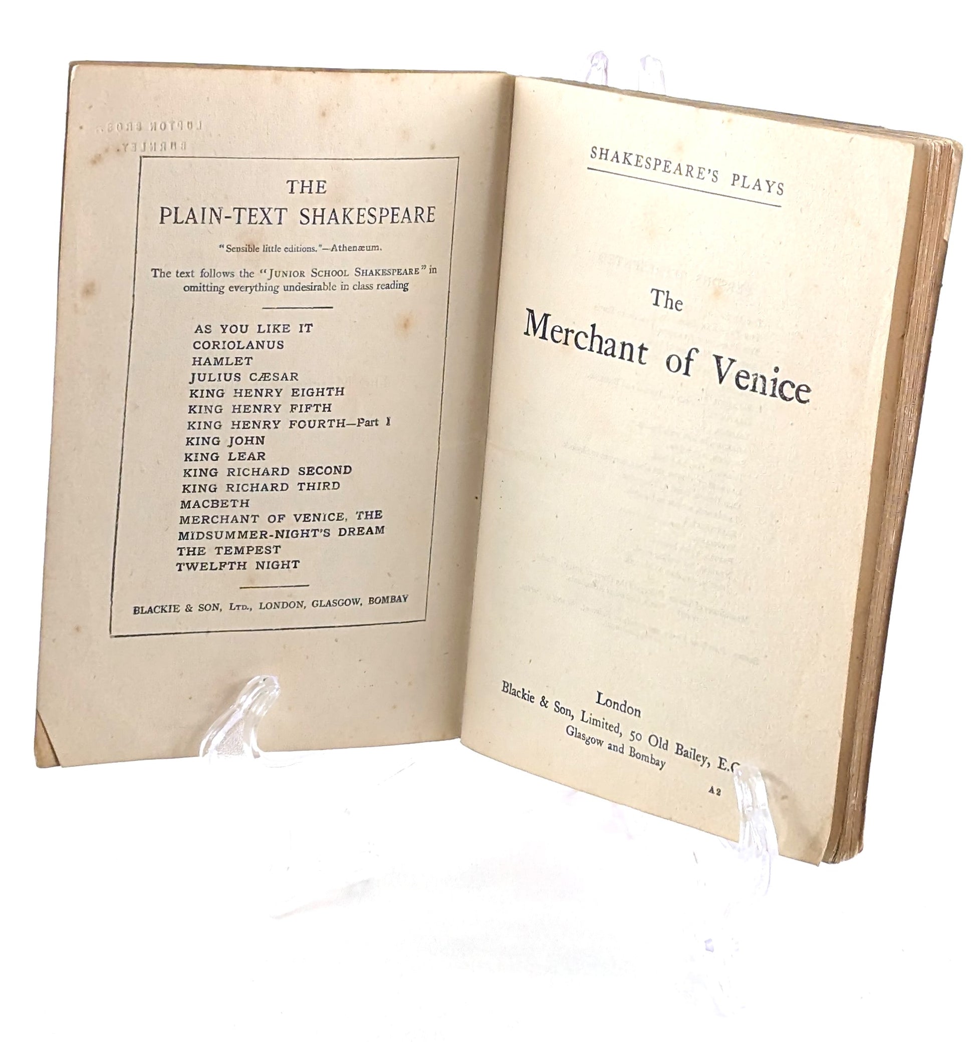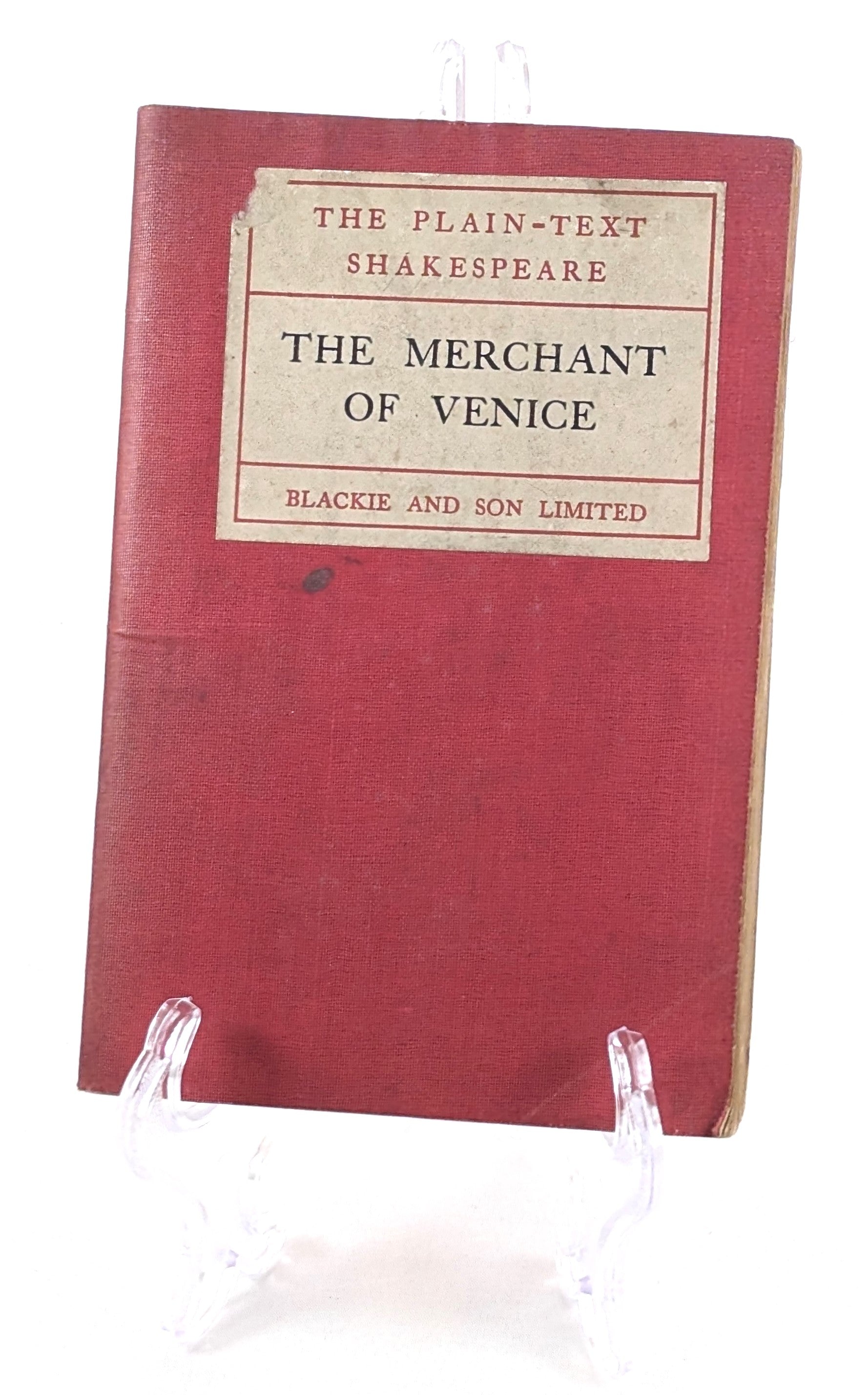 Hark, fair patrons of literature! Behold this enchanting vintage copy of The Merchant of Venice, a treasure trove of Shakespeare's immortal words. Crafted by the esteemed Blackie and Son Limited, this plain-text rendition of the Bard's play is a true gem that shall captivate hearts and minds alike.