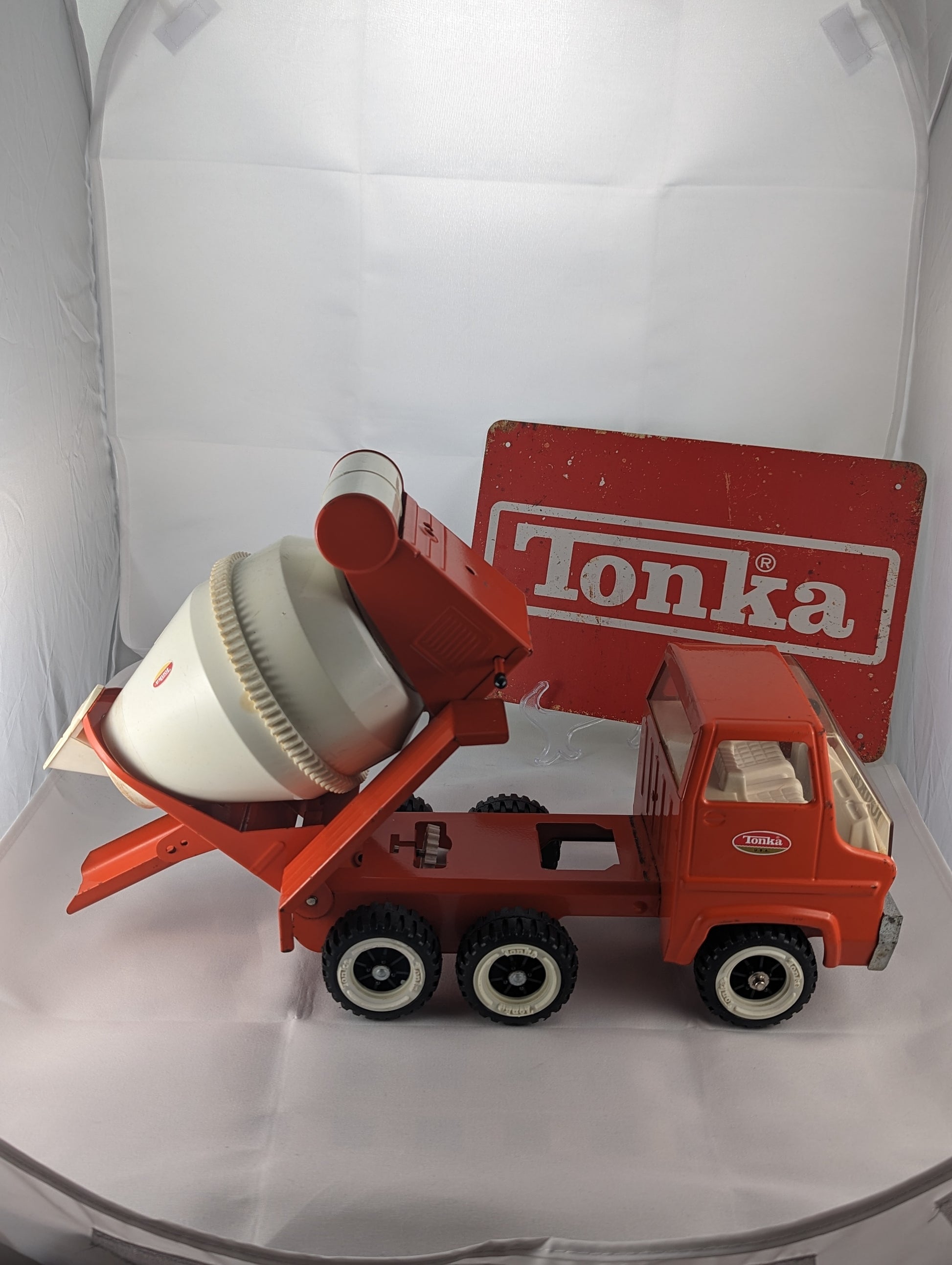 Introducing the Tonka Toy Cement Mixer - a blast from the past that will transport you straight back to the groovy 1970s! This vintage gem is not just any ordinary toy, but a magnificent gas turbine concrete mixer made of durable pressed steel. Get ready to embark on a whimsical journey down memory lane with this delightful addition to your collection.