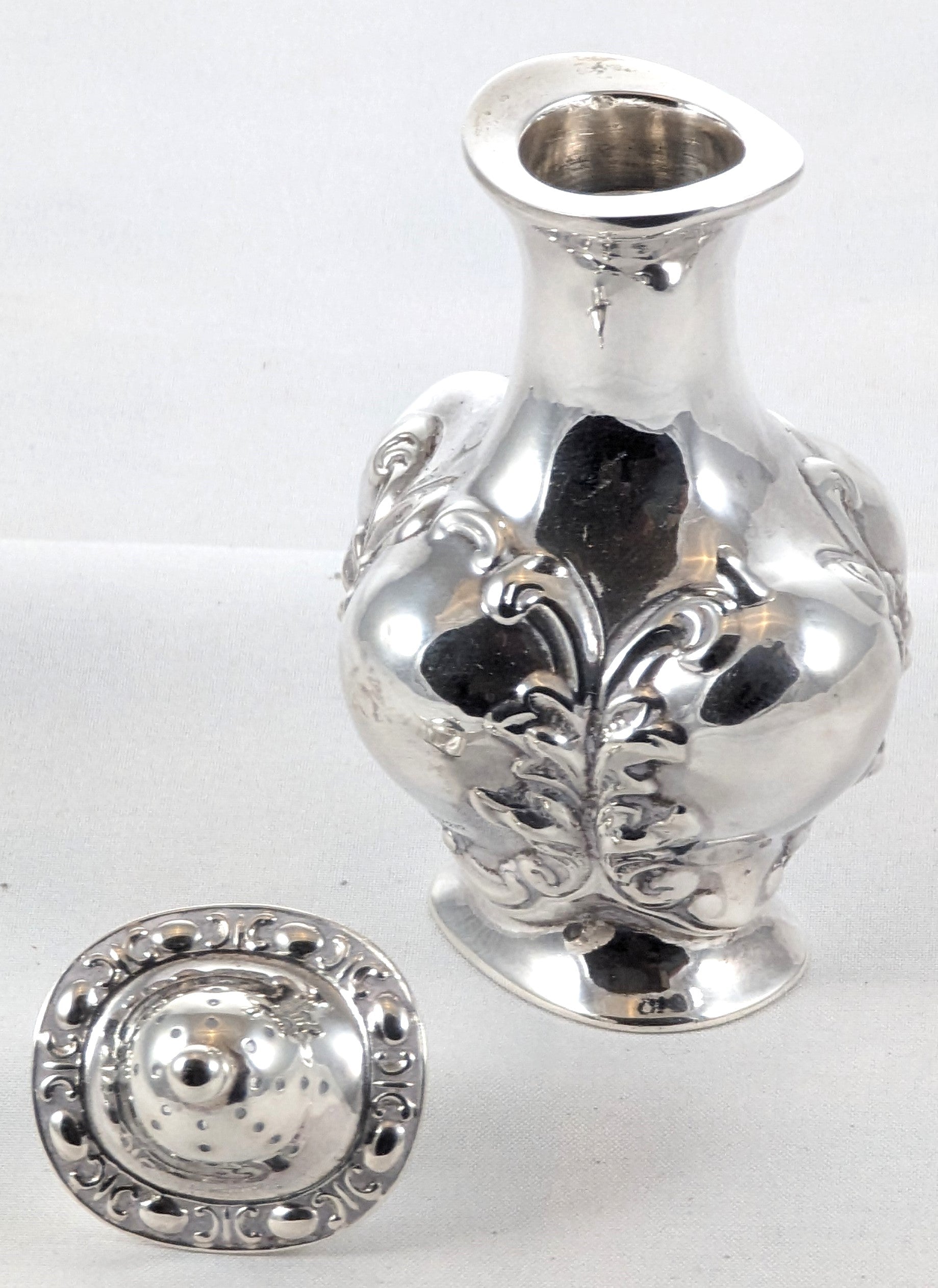 Picture a whimsical scene unfolding before your eyes as you gaze upon its intricate design. Delicate leaves, meticulously embossed, dance around the shaker, creating a mesmerizing display of nature's beauty. Every curve and contour has been carefully crafted to perfection, showcasing the impeccable craftsmanship of the Victorian era.