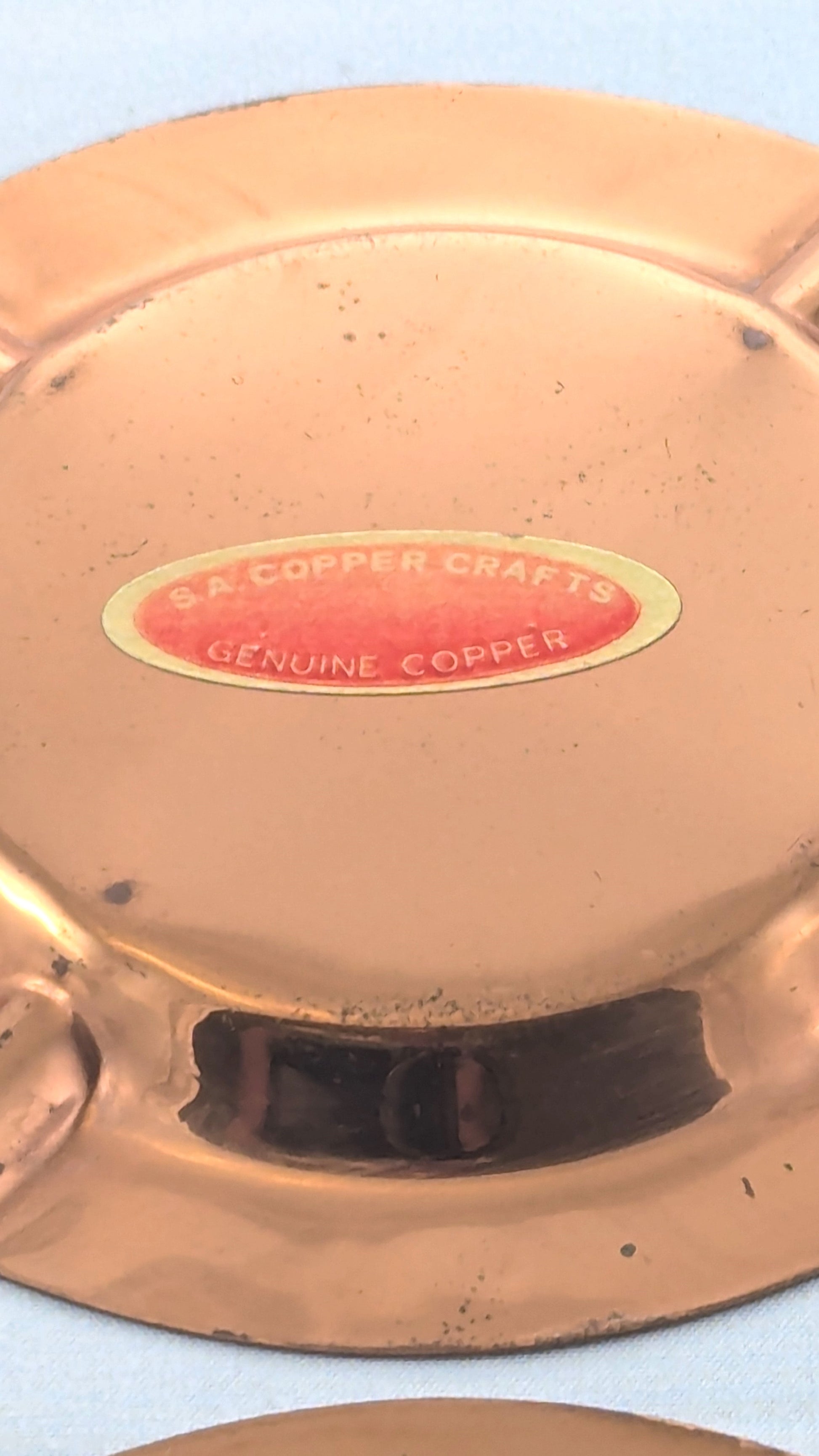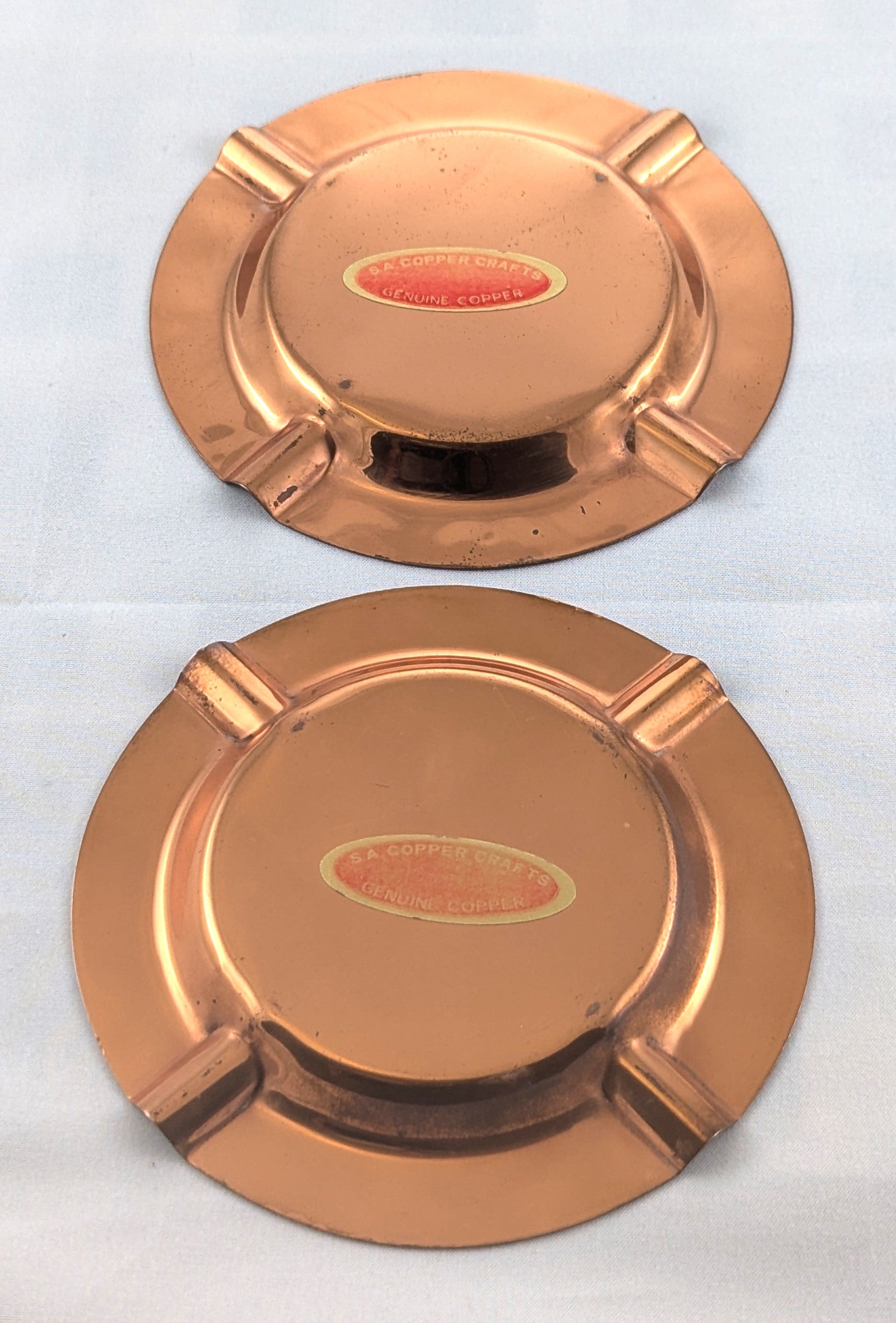 Whether you choose to utilize them for their original purpose or adorn your home with their artistic presence, these Vintage Copper Ashtrays are guaranteed to spark conversation and admiration. Elevate your living space with this striking duo and let the elegance of vintage craftsmanship shine in your home.