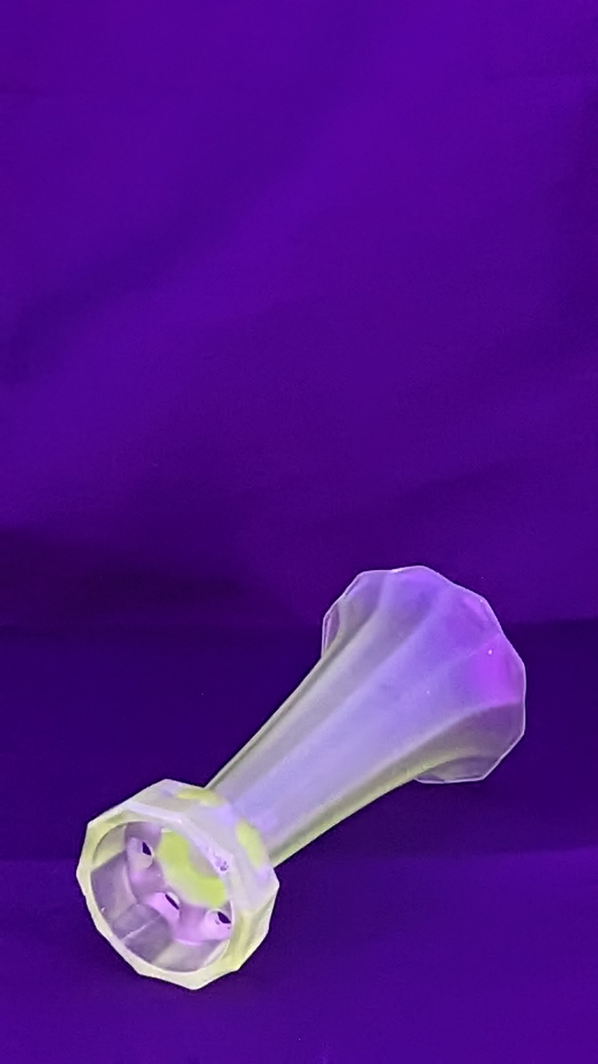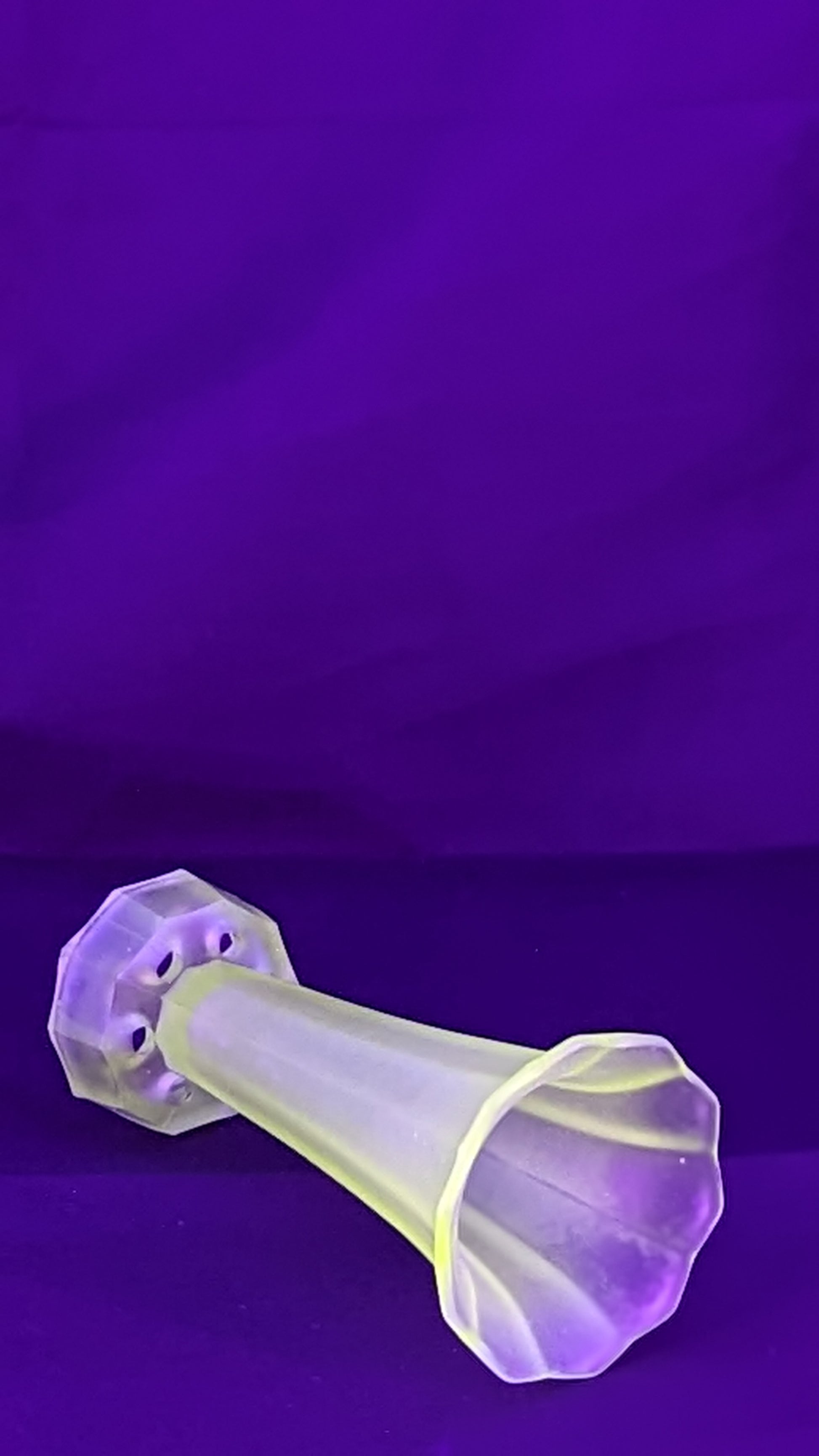 Crafted with utmost care, this vase showcases the mystical beauty of vaseline glass, delicately infused with a hint of uranium. As sunlight dances upon its surface, a breathtaking transformation occurs, revealing an ethereal luminescence that enchants all who behold it. Imagine the soft, romantic ambiance it will create in your home, casting a gentle glow that whispers of bygone eras.