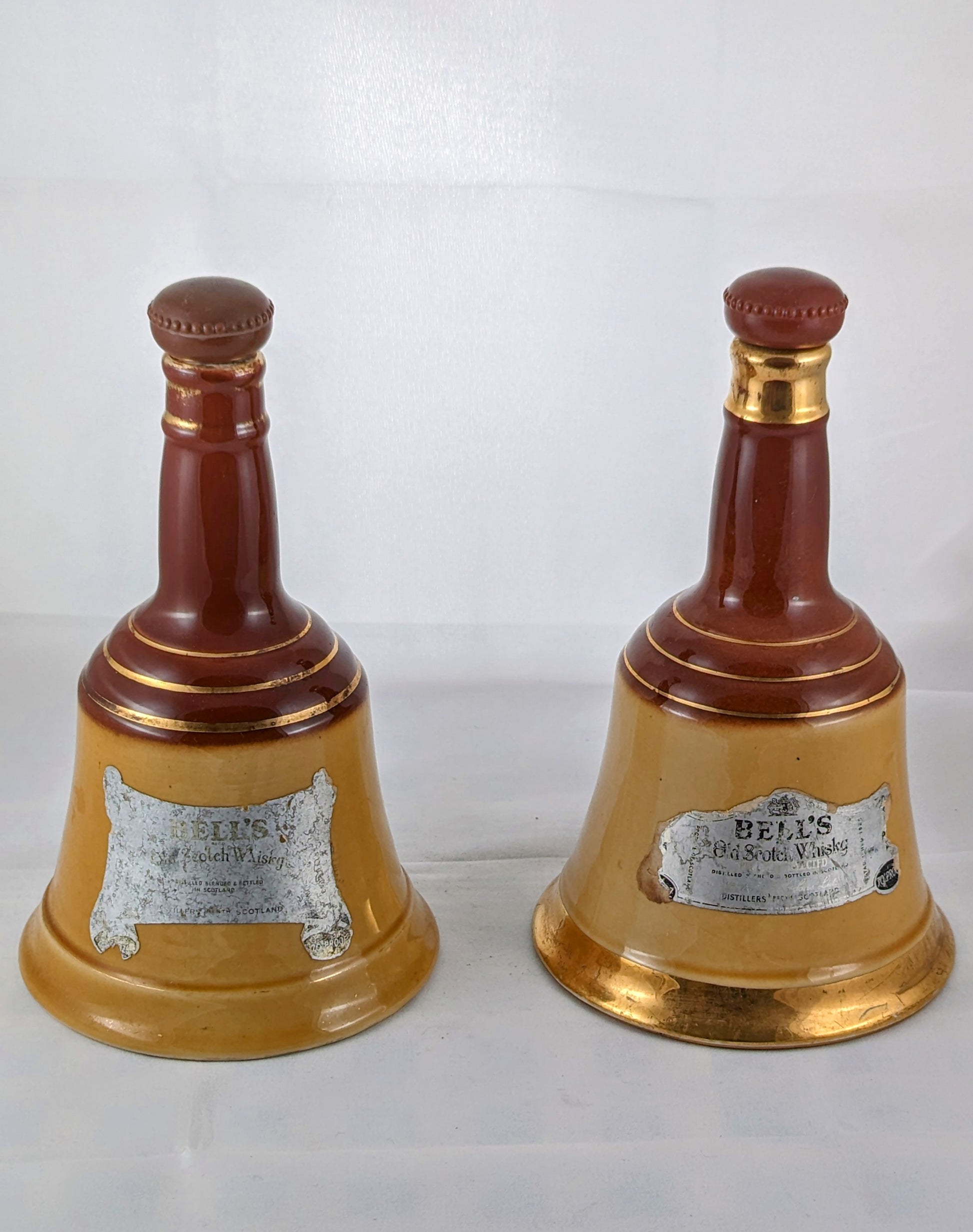 Introducing the Wade Ceramic Bells Old Scotch Whisky Decanter Lg - a true vintage gem that will elevate the ambiance of your home bar or den. Crafted by the renowned Wade ceramics in the mid-20th century, these two large ceramic bells exude an irresistible charm that is sure to captivate any whisky enthusiast.