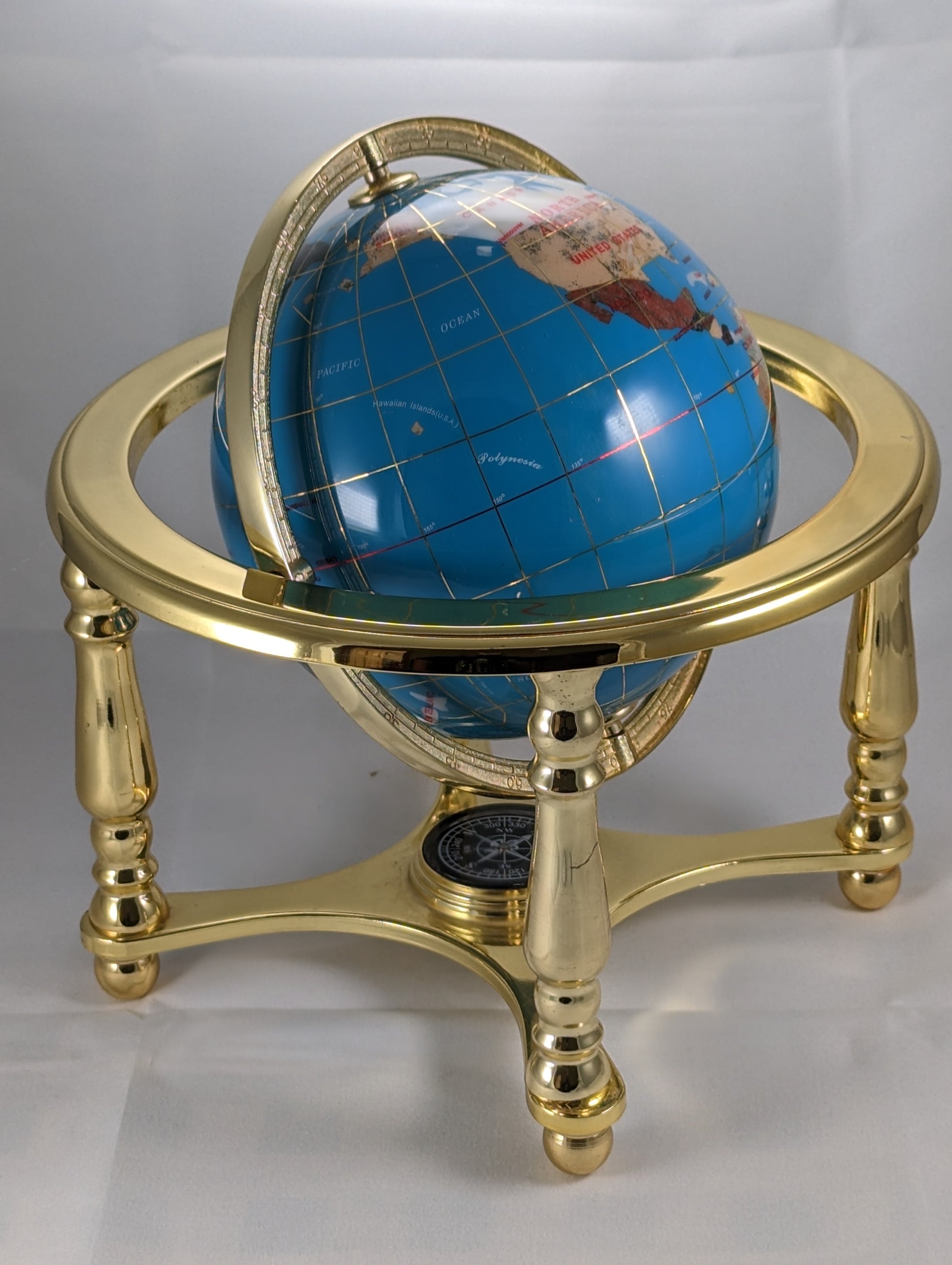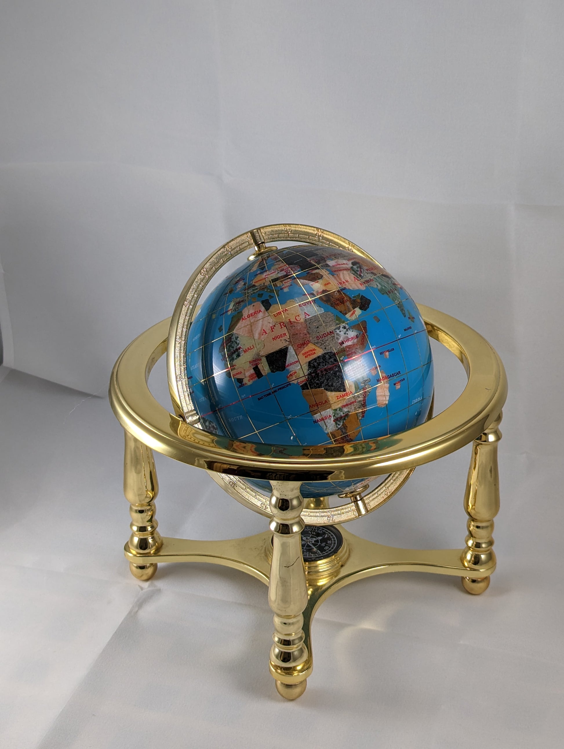 Immerse yourself in the beauty of our globe, made from a mesmerizing blue semi-precious stone. Its rich hue adds a touch of elegance to any space, while the intricate brass-type axis with its four legs provides a sturdy and sophisticated foundation, standing proud at 8 inches high.